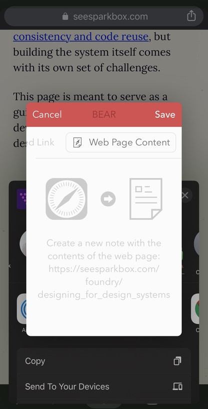 Bear’s browser plugins are great for saving articles to read for later. Like Pocket and Instapaper, it strips the page down to just the article. I give the notes a #readlater tag so I can easily find them when I have time to read.